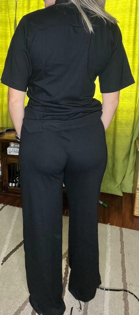 Conjunto manga corta con cuello, pantalón largo con bolsillos y ajustable.